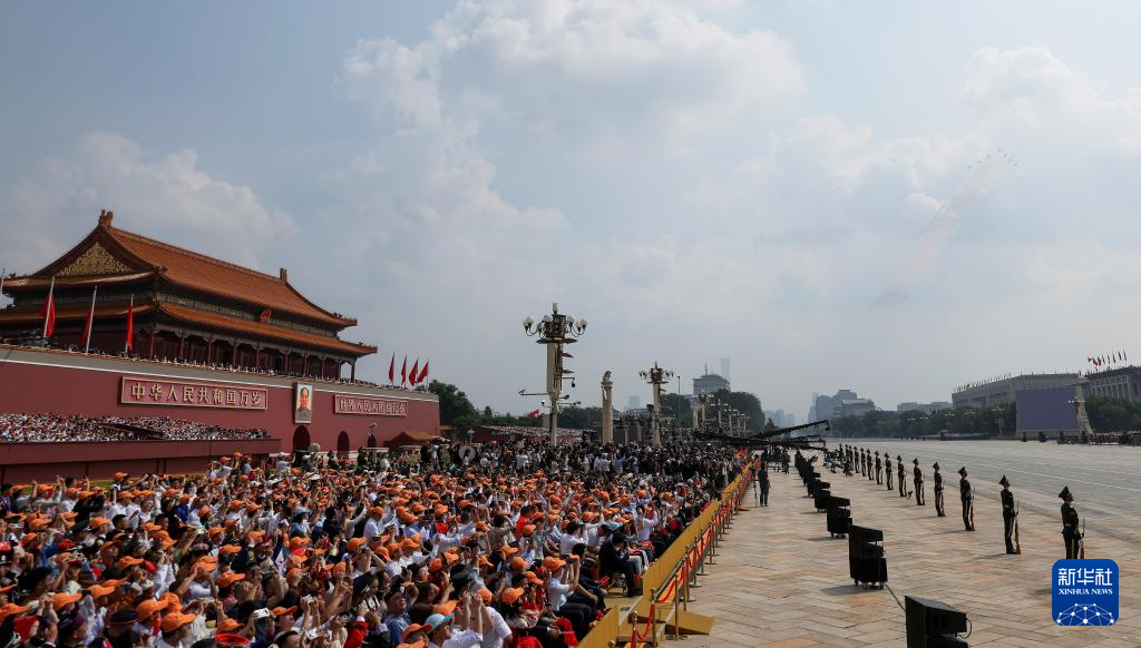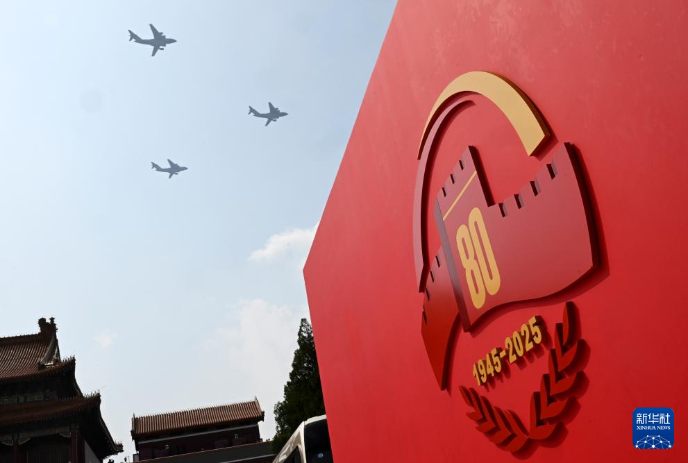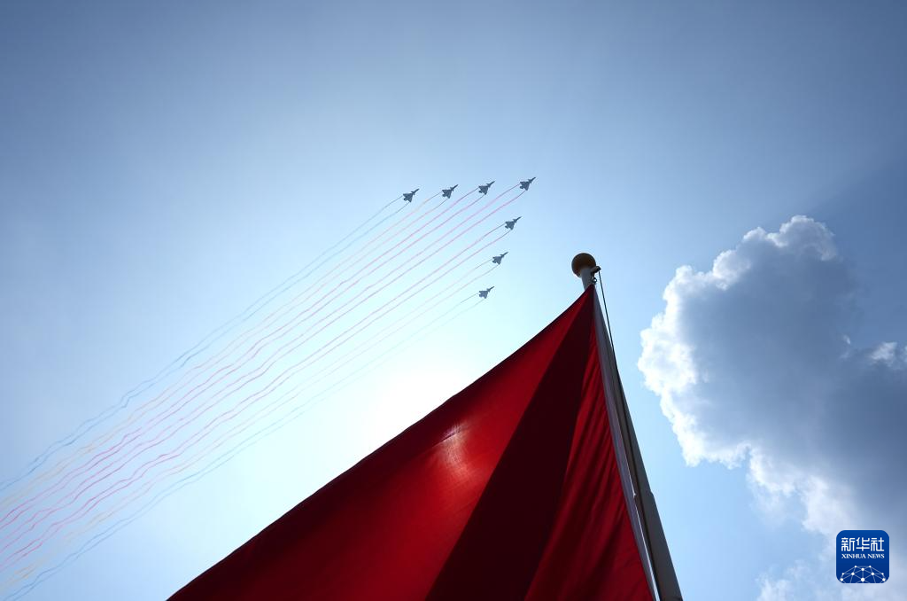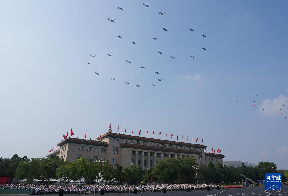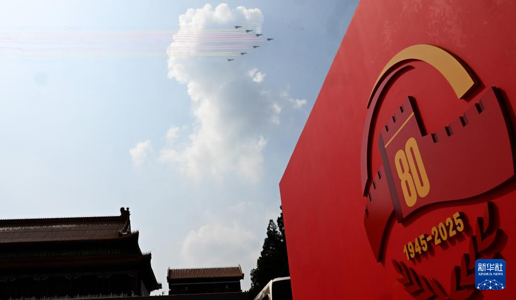9月3日,纪念中国人民抗日战争暨世界反法西斯战争胜利80周年大会在北京隆重举行。这是空中护旗梯队飞过天安门广场上空。