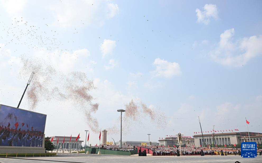 9月3日,纪念中国人民抗日战争暨世界反法西斯战争胜利80周年大会在北京隆重举行。这是纪念大会现场放飞气球与和平鸽。