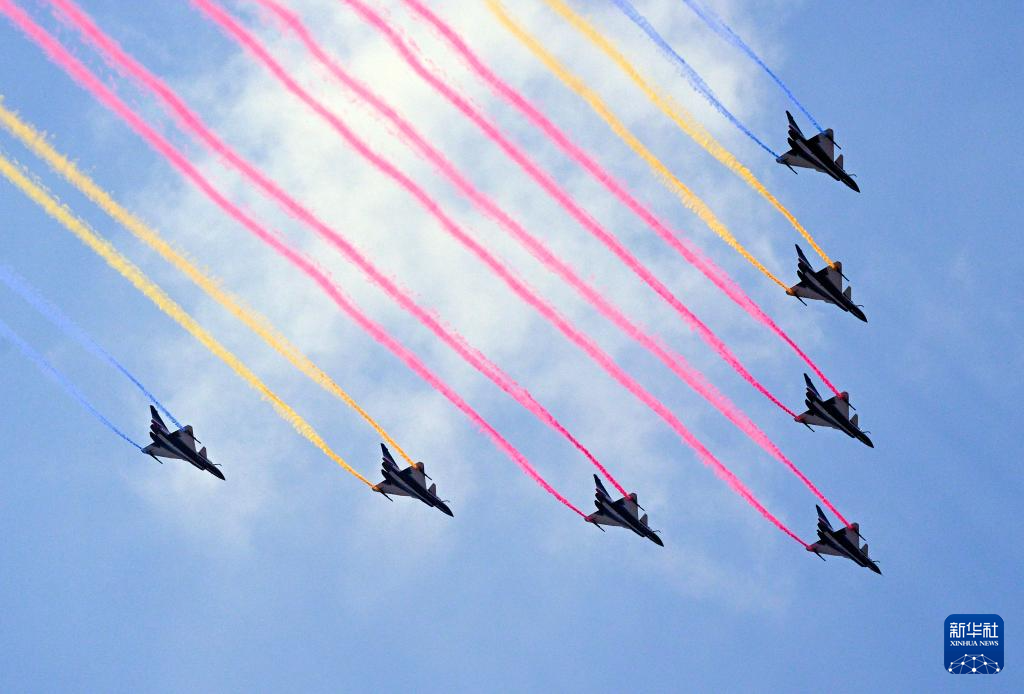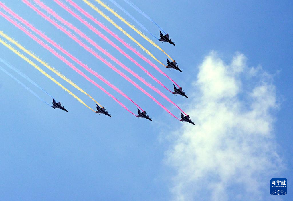 9月3日,纪念中国人民抗日战争暨世界反法西斯战争胜利80周年大会在北京隆重举行。这是教练机梯队飞过天安门广场上空。