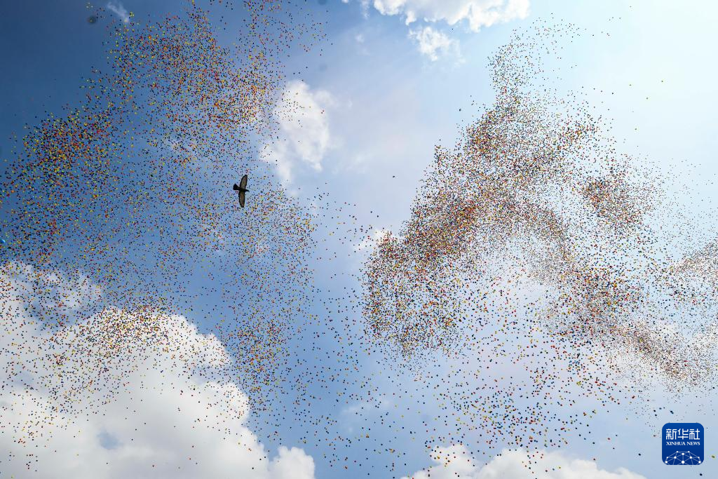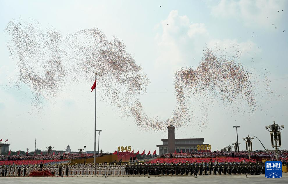 9月3日,纪念中国人民抗日战争暨世界反法西斯战争胜利80周年大会在北京隆重举行。这是纪念大会现场放飞气球和鸽子。