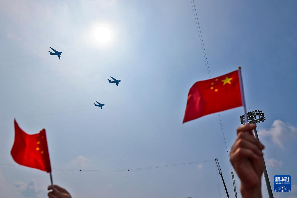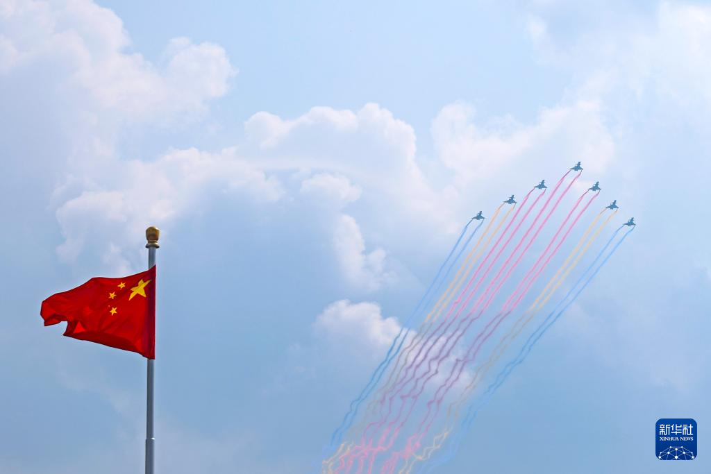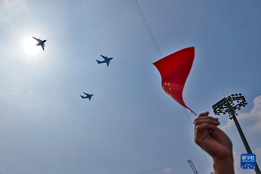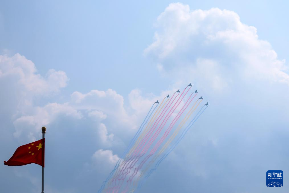 9月3日,纪念中国人民抗日战争暨世界反法西斯战争胜利80周年大会在北京隆重举行。这是空中护旗梯队接受检阅。