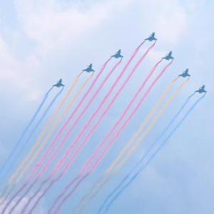 9月3日,纪念中国人民抗日战争暨世界反法西斯战争胜利80周年大会在北京隆重举行。这是在北京天坛公园拍摄的教练机梯队。