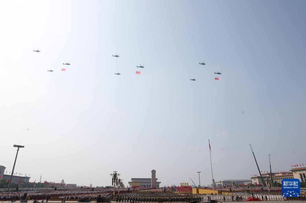 9月3日,纪念中国人民抗日战争暨世界反法西斯战争胜利80周年大会在北京隆重举行。这是空中护旗梯队通过天安门广场。