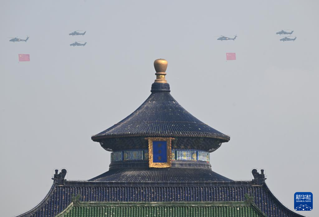 9月3日,纪念中国人民抗日战争暨世界反法西斯战争胜利80周年大会在北京隆重举行。这是空中护旗梯队通过天安门广场,26架直-19武装直升机组成“80”字样。