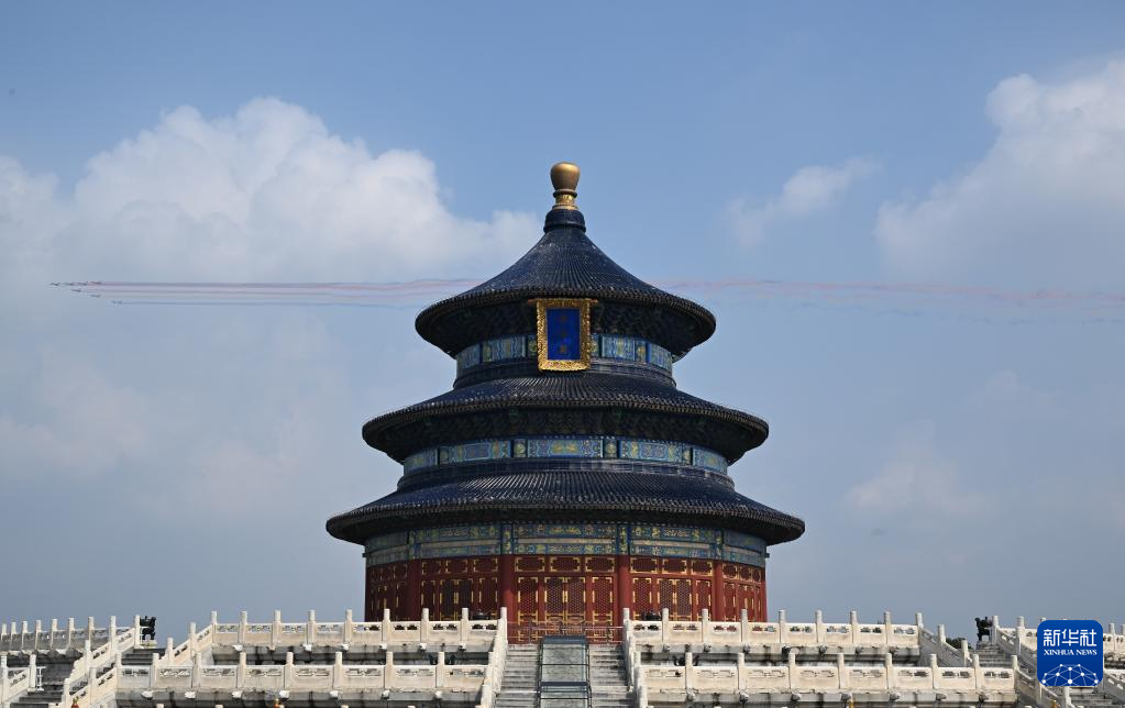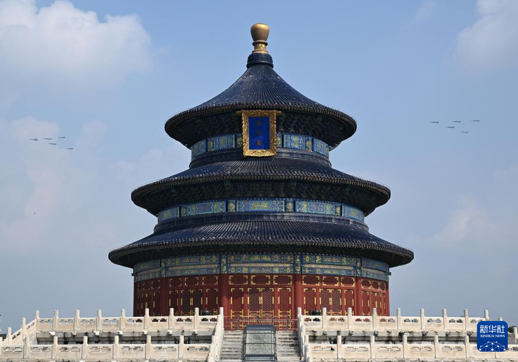 9月3日,纪念中国人民抗日战争暨世界反法西斯战争胜利80周年大会在北京隆重举行。这是在北京天坛公园拍摄的空中护旗梯队。