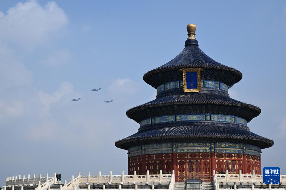 9月3日,纪念中国人民抗日战争暨世界反法西斯战争胜利80周年大会在北京隆重举行。这是在北京天坛公园拍摄的运输机梯队。