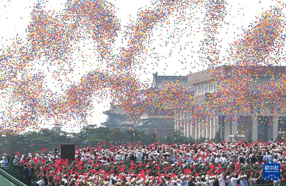 9月3日,纪念中国人民抗日战争暨世界反法西斯战争胜利80周年大会在北京隆重举行。这是纪念大会现场放飞气球。