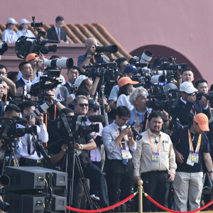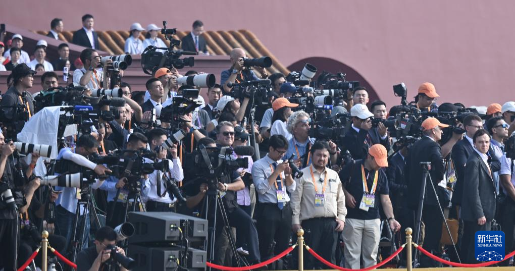 9月3日,纪念中国人民抗日战争暨世界反法西斯战争胜利80周年大会在北京隆重举行。这是报道大会的媒体记者。