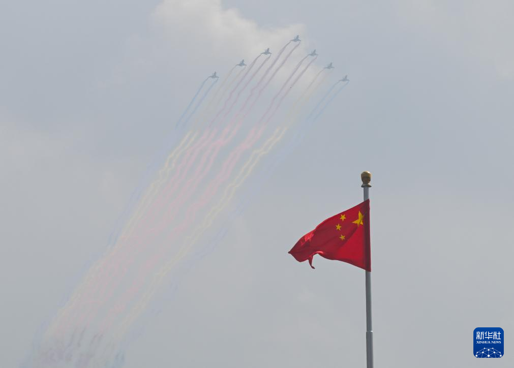 9月3日,纪念中国人民抗日战争暨世界反法西斯战争胜利80周年大会在北京隆重举行。这是教练机梯队飞过天安门广场上空。