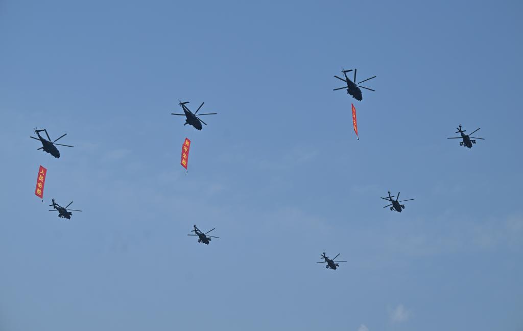 3架直-8L运输直升机,则分别悬挂“正义必胜”“和平必胜”“人民必胜”标语,与7架直-20T直升机组成三角队形依次通场。
