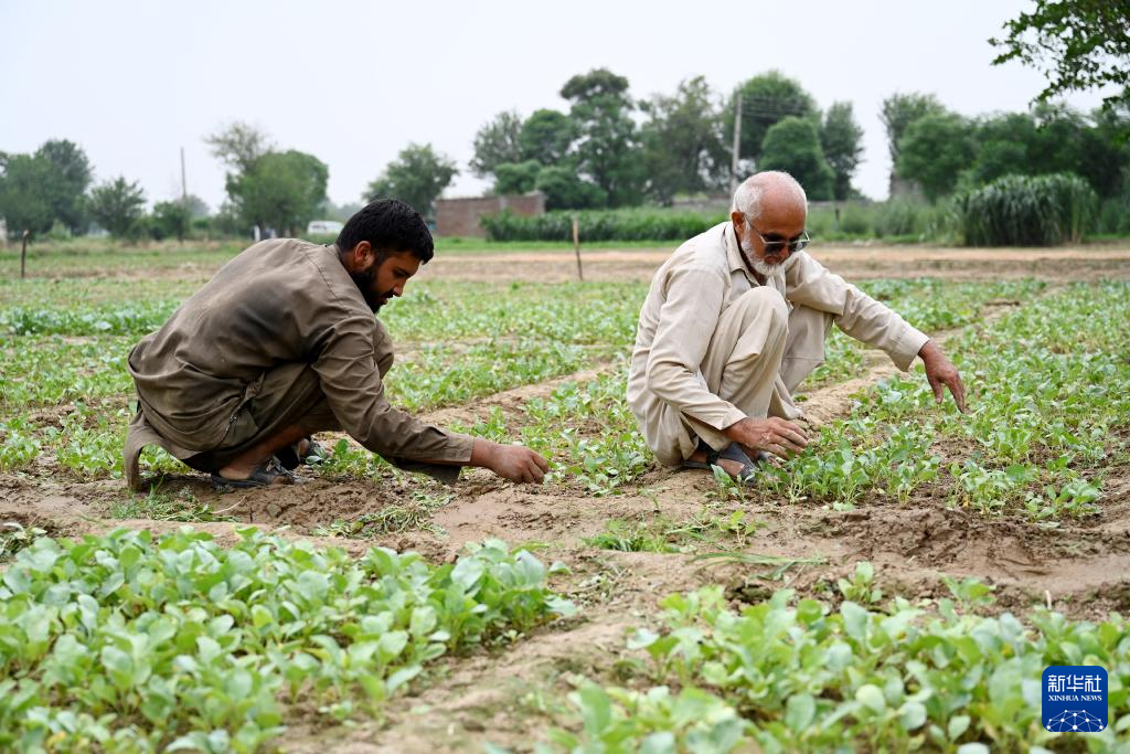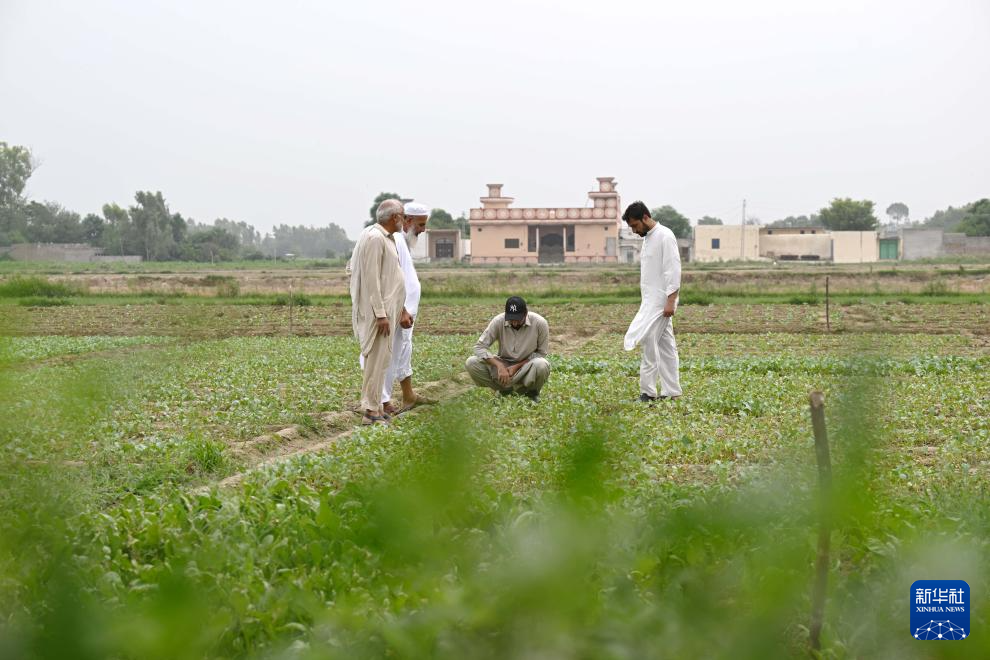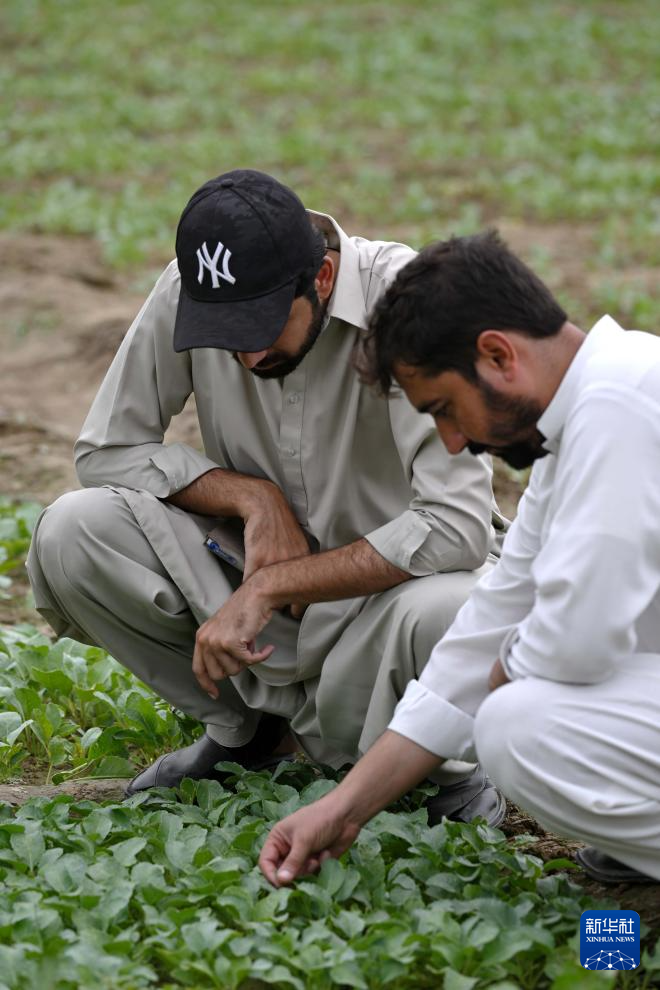 8月13日,在巴基斯坦东部旁遮普省阿塔克县,农民穆罕默德·萨夫达尔(右)查看农田中引进自中国天津的花椰菜苗。 新华社发(达尼亚勒·汗·贾敦摄)