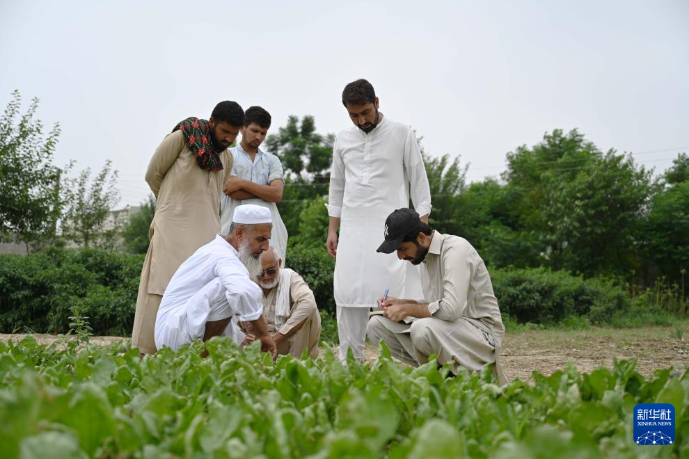 8月13日,在巴基斯坦东部旁遮普省阿塔克县,巴基斯坦农业技术人员查看农田中引进自中国天津的花椰菜苗。 新华社发(达尼亚勒·汗·贾敦摄)