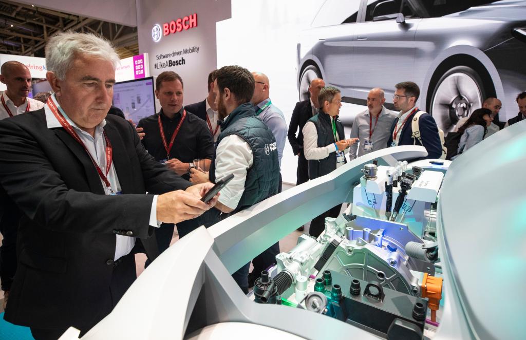 9月9日,一名男子在德国慕尼黑国际车展的博世展台参观拍照。新华社记者 张帆 摄