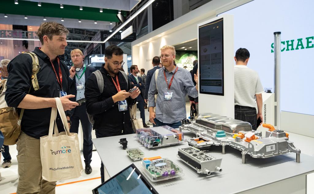 9月9日,人们在德国慕尼黑国际车展的采埃孚展台参观。新华社记者 张帆 摄