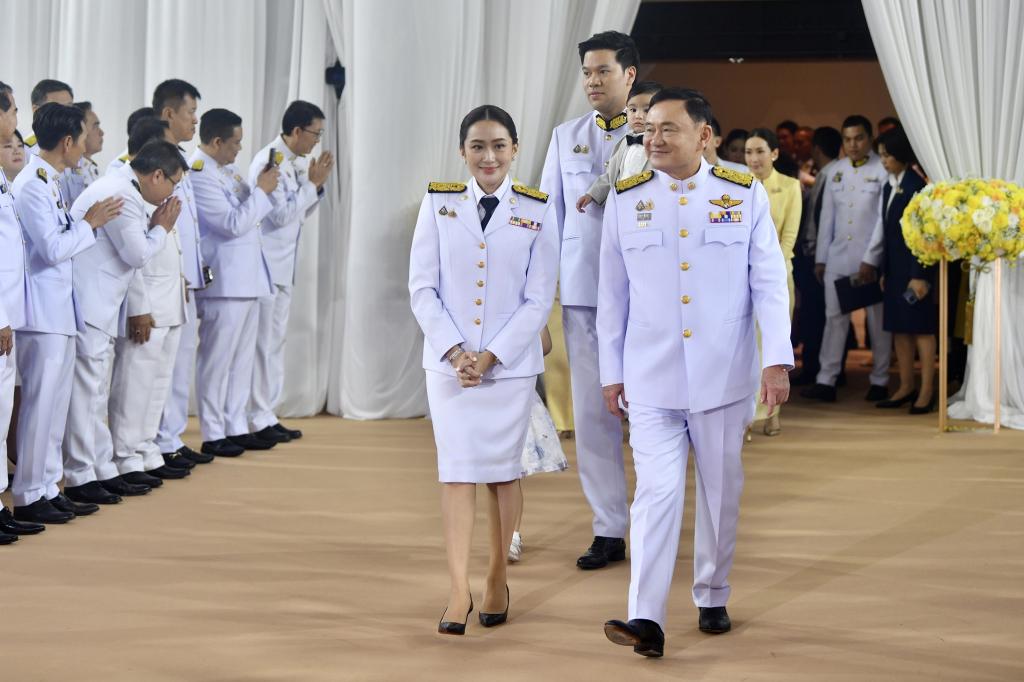 2024年8月18日,在泰国曼谷,佩通坦·钦那瓦(左)在其父亲、前总理他信(右)的陪同下进入总理任命仪式会场。新华社发(泰国总理府供图)