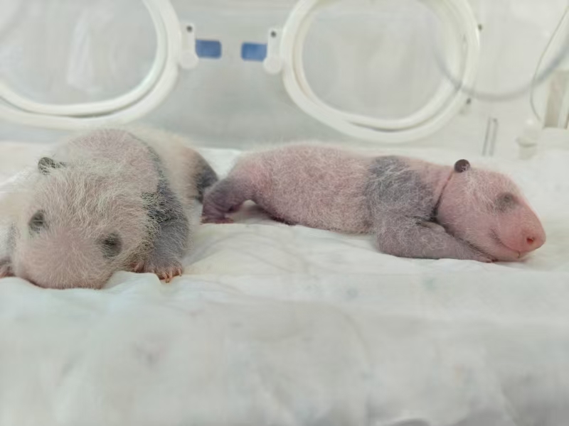目前,熊猫宝宝粉色皮肤上的白色绒毛已十分明显,眼圈、耳朵、肩带、前后肢也渐显大熊猫的标志性黑色,“芊金”与龙凤胎幼崽身体健康状况均稳定。