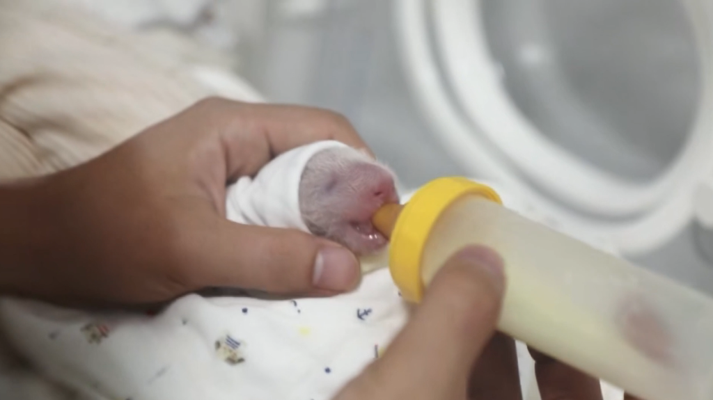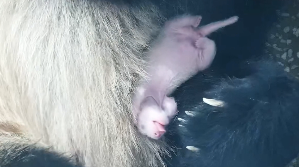 上海熊猫小囡“芊金”2017年10月10日在上海出生,今年8岁。虽然是第一次当妈妈,但是诞下幼崽“芊金”尽显母性。“当双胞胎姐姐出生后,‘芊金’迅速将幼崽叼起来,抱进怀中,舔舐崽崽,给幼崽温暖。”