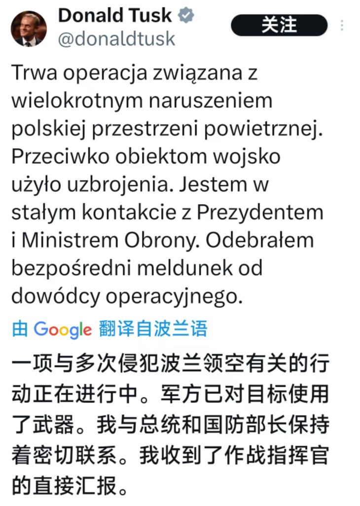 波兰总理图斯克在社交媒体上说:“一项与多次侵犯波兰领空有关的行动正在进行中,军方已对目标动用了武器。我正与总统、国防部长保持密切联系,已听取来自作战指挥官的直接汇报。”