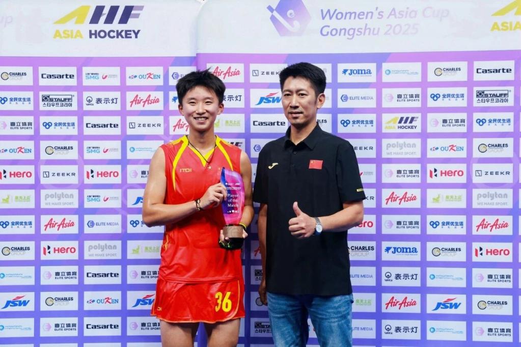 刘晨诚(左)获得本场最佳球员。图片来源:中国曲棍球协会官方公众号