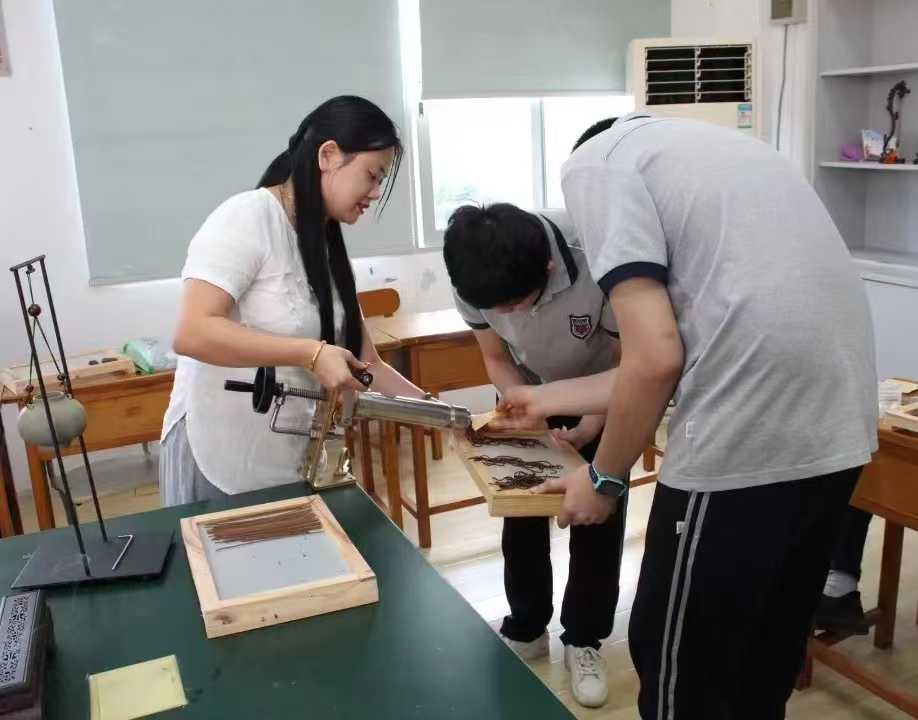学生们摇动手动制香机,把香品一根根整齐排好,再把制好的香品放进包装盒,动作虽不特别敏捷,却十分精准,整个过程没有一根香品被折断。