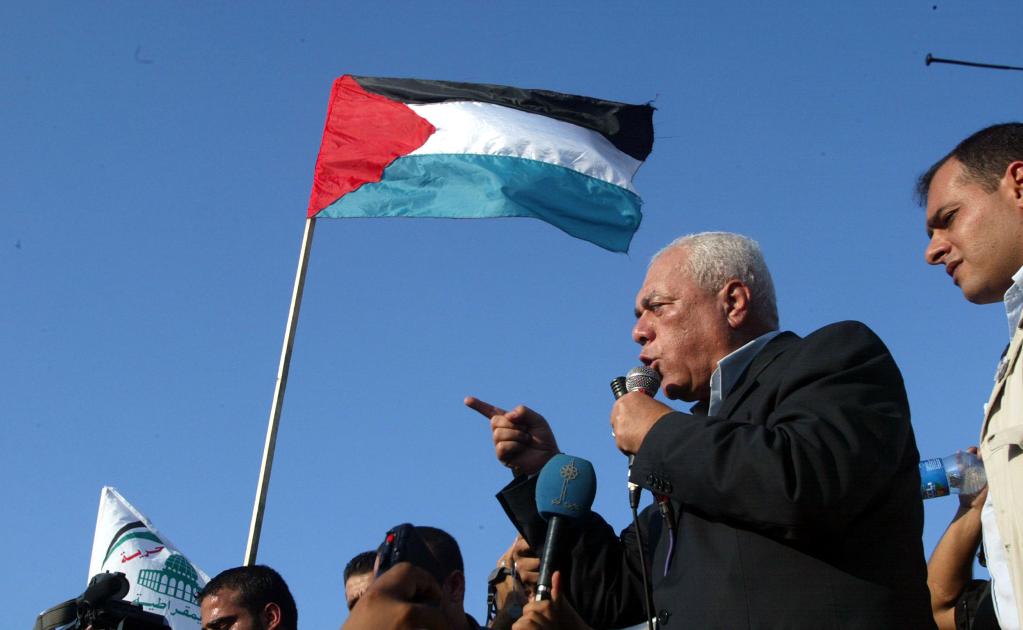 2005年9月14日,在加沙地带南部的汗尤尼斯地区的原犹太人定居点内,巴勒斯坦总统府秘书长塔伊夫(右二)代表民族权力机构主席阿巴斯出席庆祝活动。新华社记者王昊摄