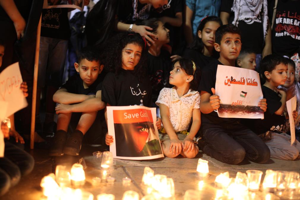 2014年7月29日,在约旦河西岸城市伯利恒,巴勒斯坦人在圣诞教堂前为加沙儿童祈福。新华社发(鲁埃·萨巴巴摄)
