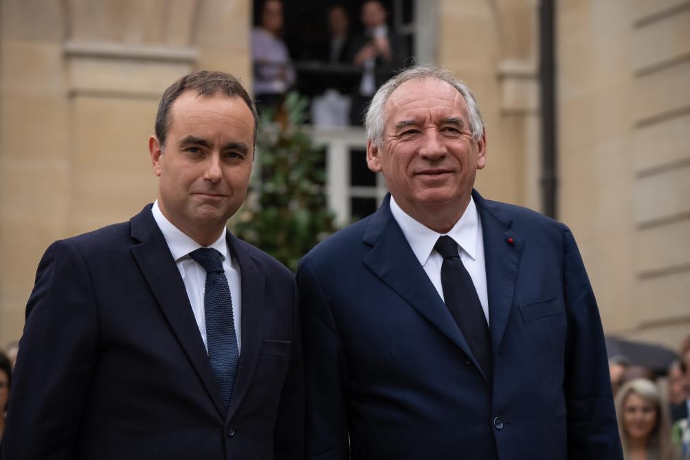 9月10日,在法国巴黎总理府,法国卸任总理贝鲁(右)与新任总理勒科尔尼出席交接仪式。新华社发(奥雷利安·莫里萨尔摄)