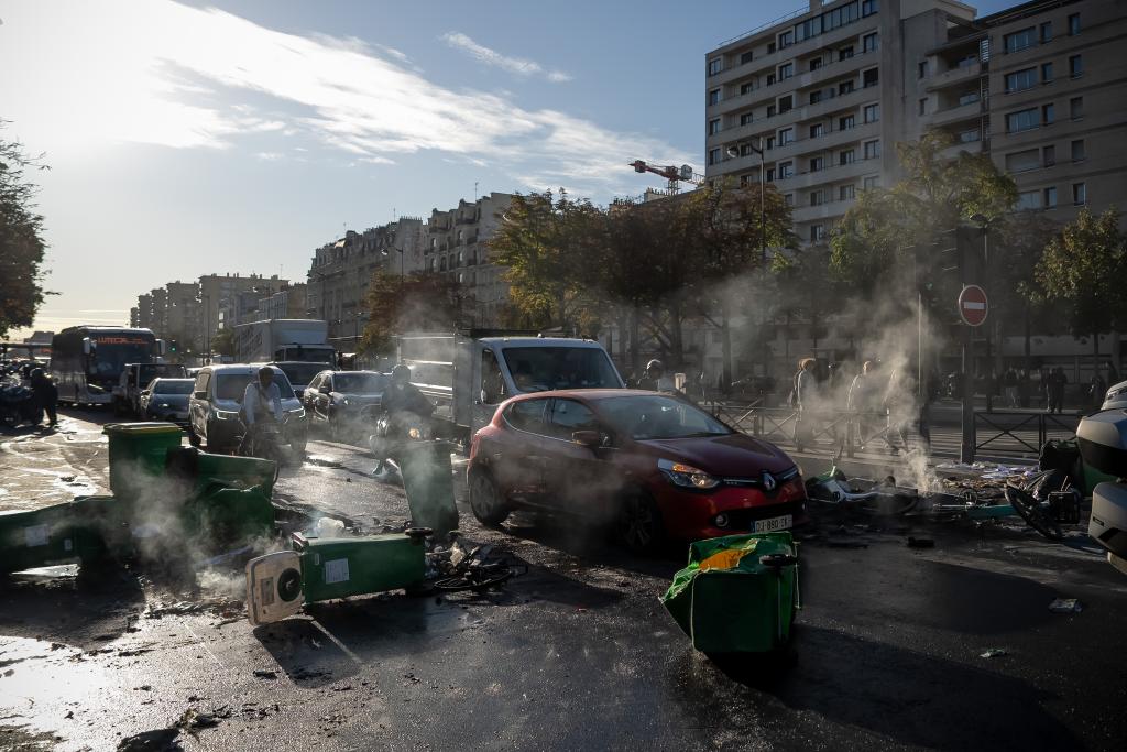 9月10日,在法国巴黎街头,示威者用垃圾桶封锁道路。新华社发(奥雷利安·莫里萨尔摄)