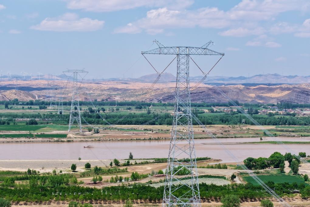 宁夏至湖南±800千伏特高压直流输电工程线路跨越黄河。(受访者供图)