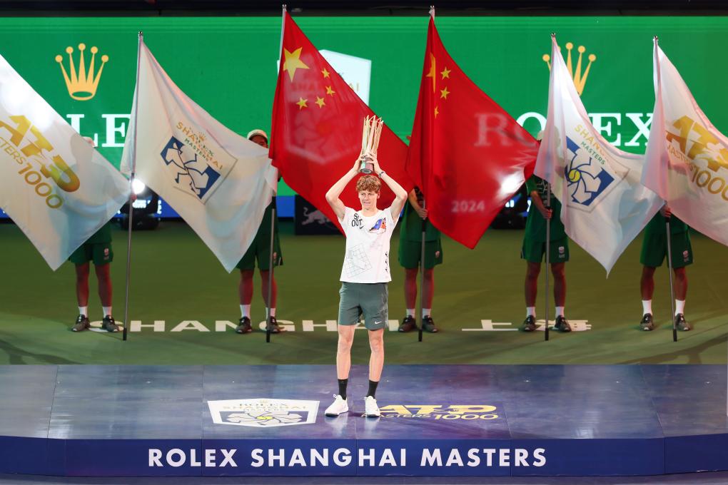 在2024年ATP上海网球大师赛男单决赛中,意大利选手辛纳以2:0战胜塞尔维亚选手焦科维奇,获得冠军。新华社记者 王翔 摄