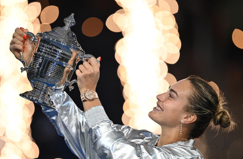 9月6日,在2025美国网球公开赛女子单打决赛中,白俄罗斯选手萨巴伦卡以2:0战胜美国选手阿尼西莫娃,获得冠军。新华社记者 李睿 摄