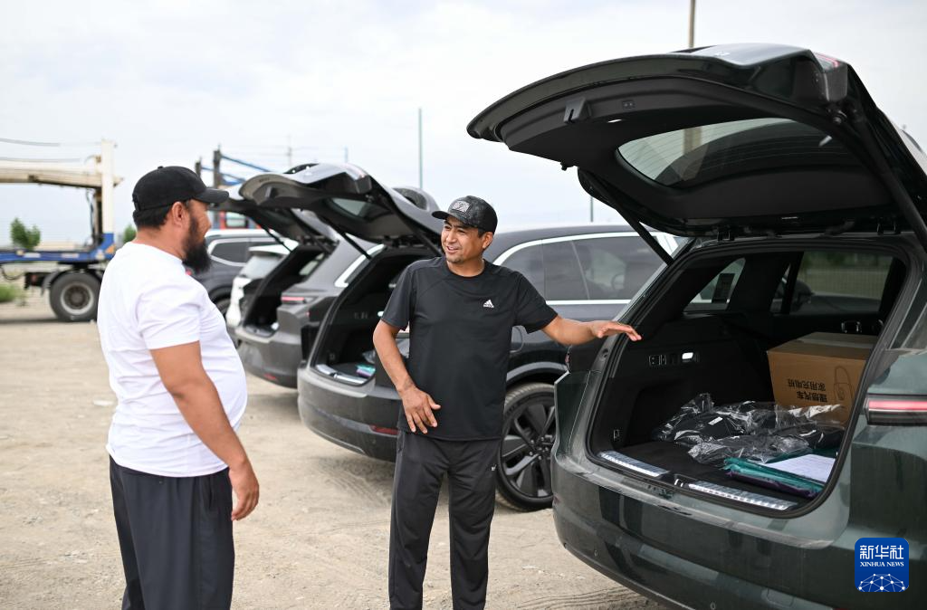 5月22日,运输公司的工作人员驾驶从中国进口的新能源汽车驶向哈萨克斯坦扎尔肯特镇的中转停车场。新华社记者 李任滋 摄
