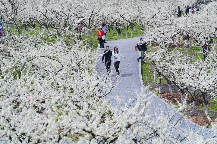 2025年3月19日,游客在重庆市北碚区静观镇中华村山驿食集踏青赏花。新华社发(秦廷富 摄)