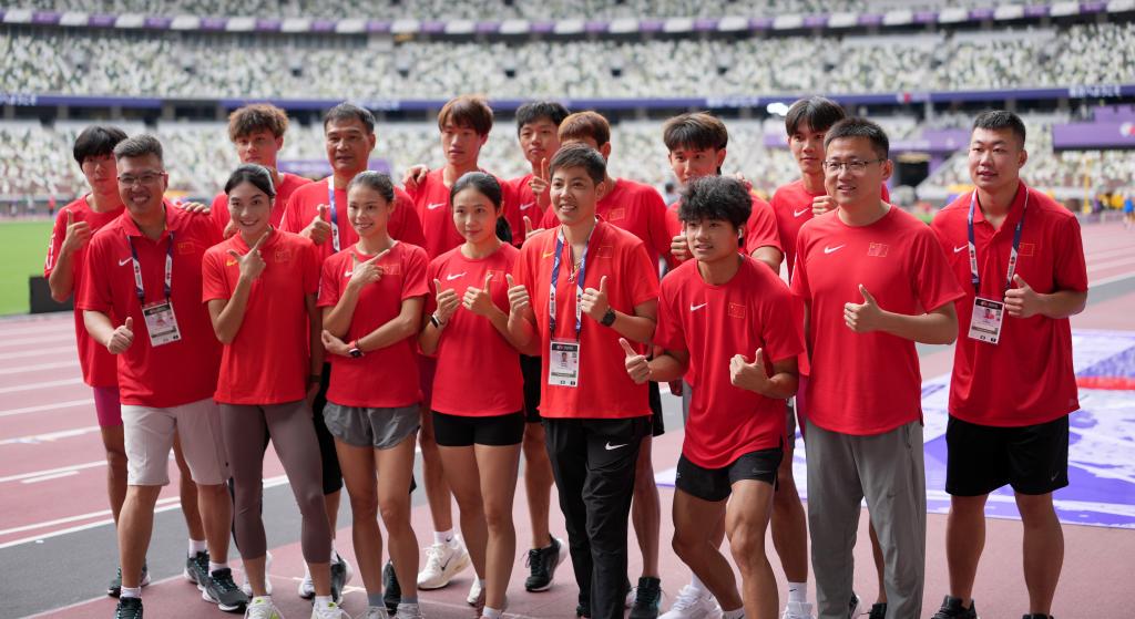 9月12日,中国田径队部分成员在比赛场地内合影。新华社记者 李钢 摄