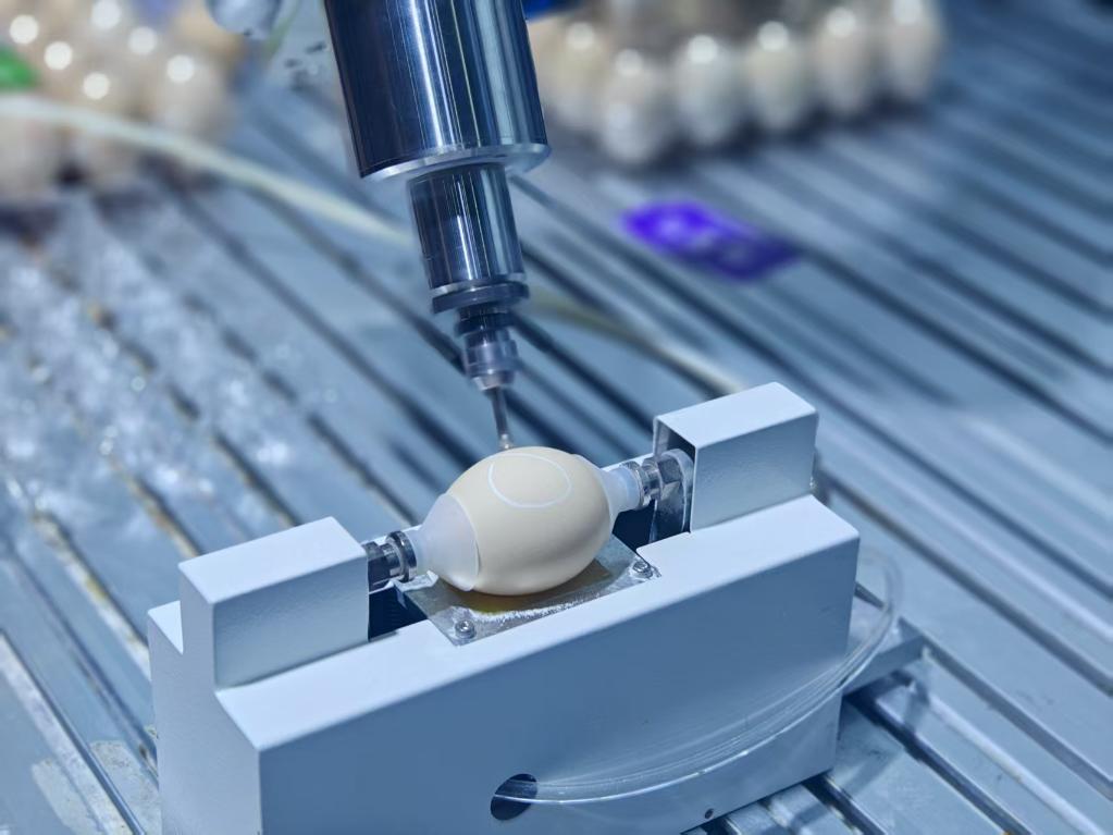 外滩大会上,非夕科技自适应机器人在蛋壳上雕刻。新华社记者张千千 摄