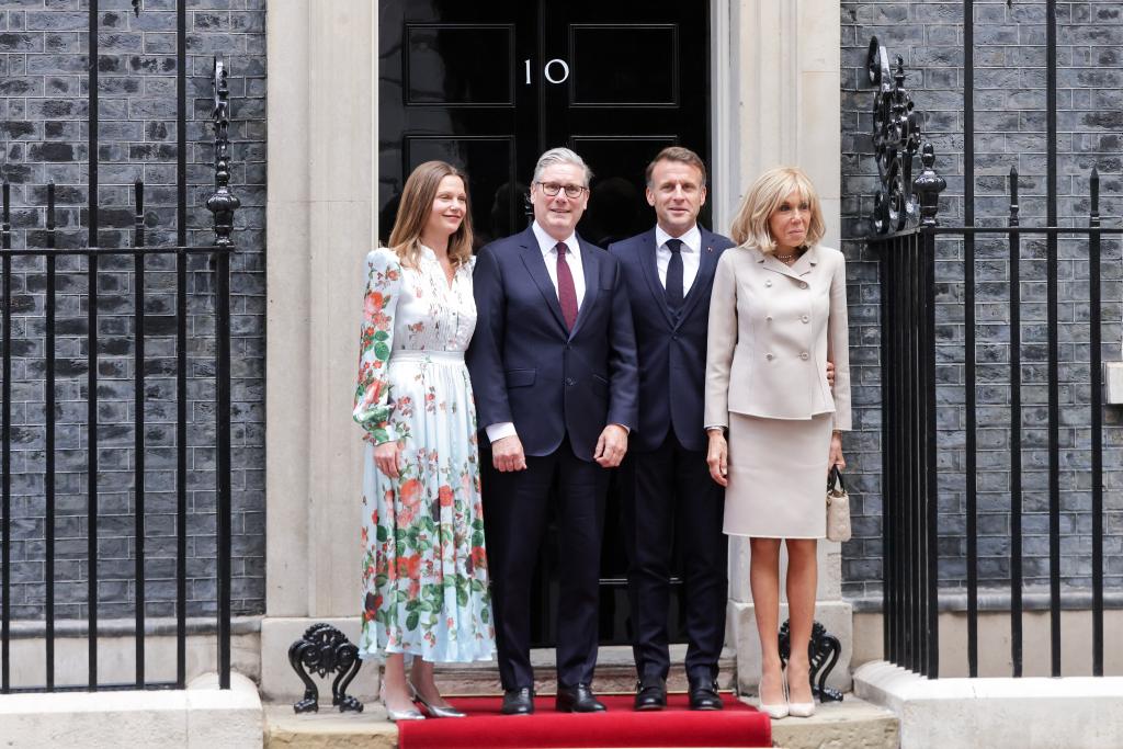 7月9日,英国首相斯塔默(左二)和夫人(左一)在英国伦敦唐宁街10号首相府前迎接法国总统马克龙(右二)和夫人。新华社发