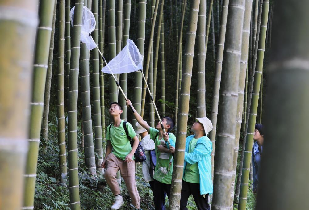 2022年7月,首届武夷山国家公园自然教育活动在武夷山国家公园举行,参加活动的中小学生在武夷山国家公园大竹岚捕捉昆虫。新华社记者 姜克红 摄