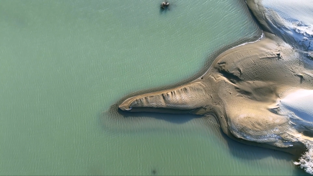 随着新疆塔里木河流域生态输水的进行,日前,在巴音郭楞蒙古自治州轮台县草湖乡国家沙化土地封禁保护区内,沙丘经水流冲刷、风蚀塑造,形成了“巨象汲水”的奇特画面。