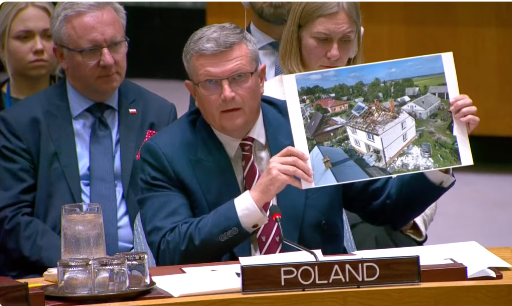 波兰常驻联合国代表博萨茨基在安理会审议波兰领空无人机事件时发言的视频截图。