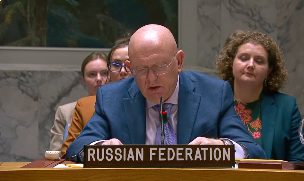 俄罗斯常驻联合国代表涅边贾在安理会审议波兰领空无人机事件时发言的视频截图。