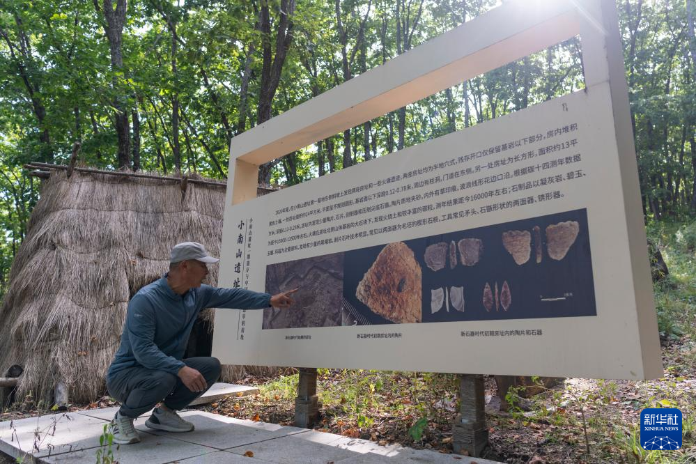 饶河县文物保护中心副研究馆员杨永才在小南山遗址讲解(8月21日摄)。新华社记者 谢剑飞 摄