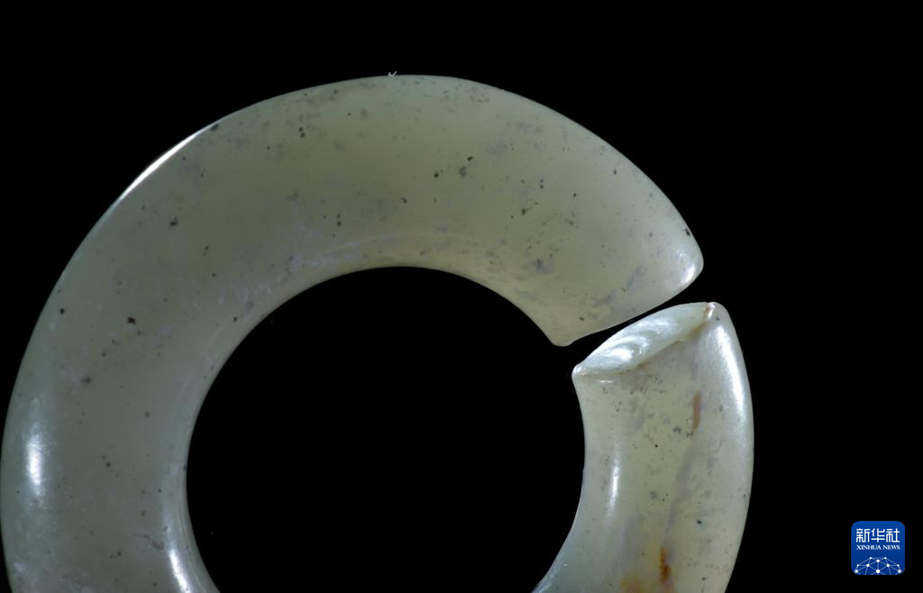 这是黑龙江饶河小南山遗址出土的玉玦,玦口处可见砂绳切割技术留下的弯曲条形痕迹(资料照片)。新华社发(黑龙江省文物考古研究所供图)