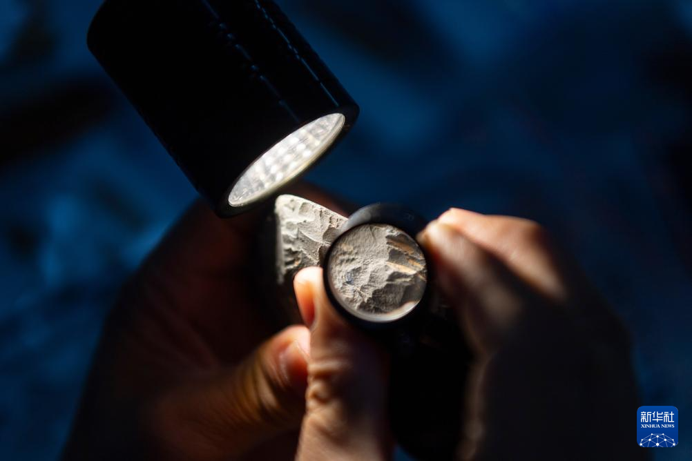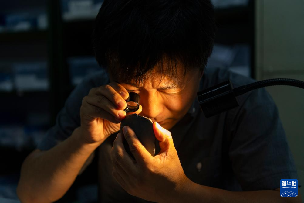 在位于哈尔滨市的黑龙江省文物考古研究所,工作人员用放大镜查看小南山遗址出土石器的细节(8月27日摄)。新华社记者 谢剑飞 摄