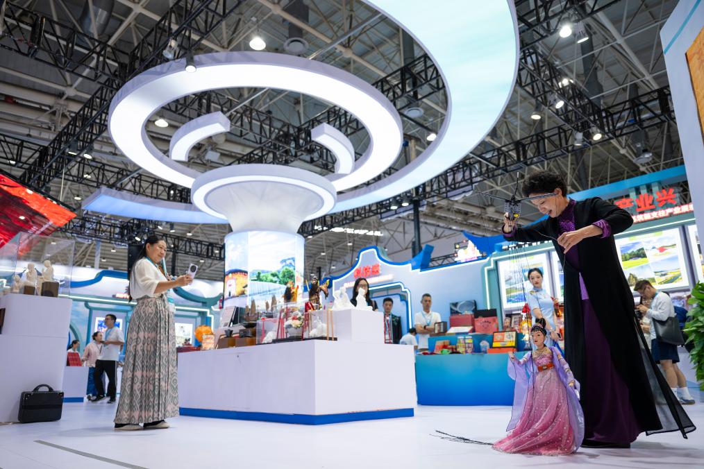 记者在现场看到,非遗技艺与现代设计相融合也成为亮点。在河南馆,只有河南·戏剧幻城景区带来了“布老虎和泥泥狗”非遗元素的零钱包和盲盒;在湖北恩施馆,西兰卡普织锦纹样的国潮背包吸引不少年轻人驻足;在非遗工坊,观众们可以体验古法香牌、植物染罗帕、蜀派香囊等制作。