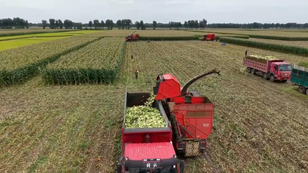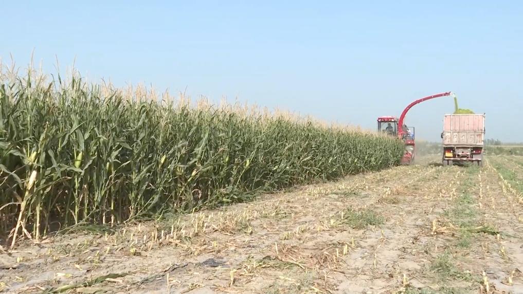 新疆巴音郭楞蒙古自治州焉耆县的1.5万亩青贮玉米迎来丰收。在永宁镇九号渠村,大型青贮收割加工机将一株株玉米从根部割断,粉碎后抛入集草车。