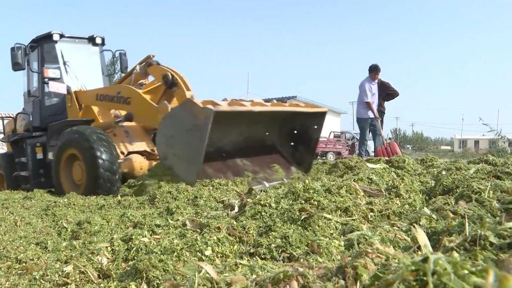 在焉耆县永烨牛羊生态养殖专业合作社内,工作人员将新鲜采收的青贮玉米搬到青贮窖中压实,为牲畜越冬提前备足“口粮”。