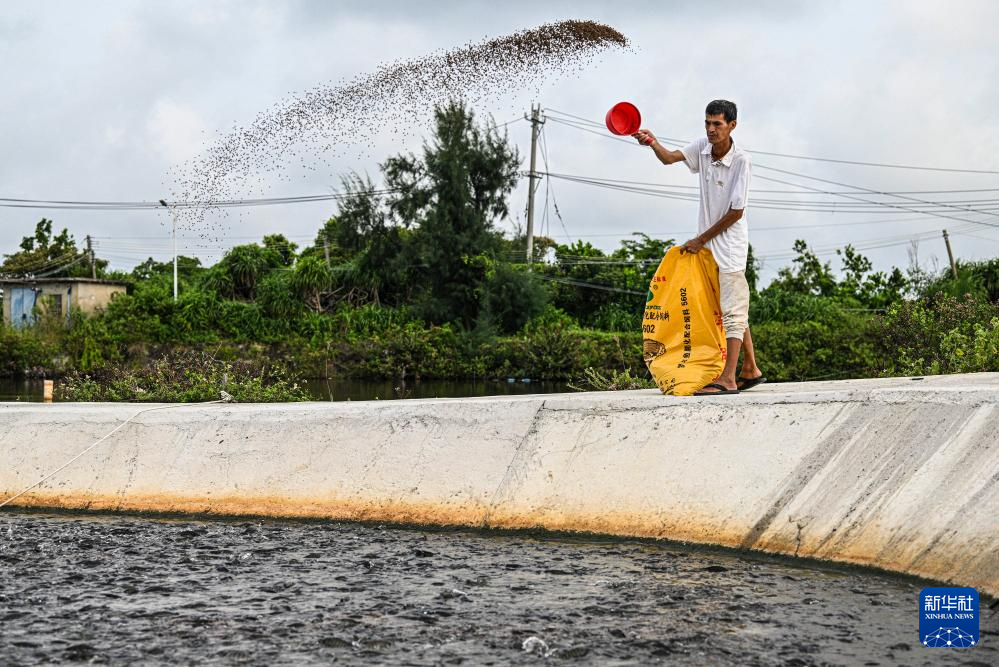 9月8日,村民在海南省文昌市文教镇加美村养殖塘喂鱼。