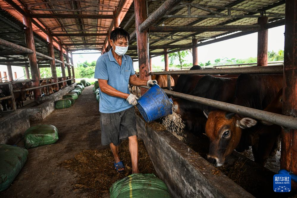 9月8日,村民在海南省文昌市文教镇加美村小黄牛育肥基地喂牛。