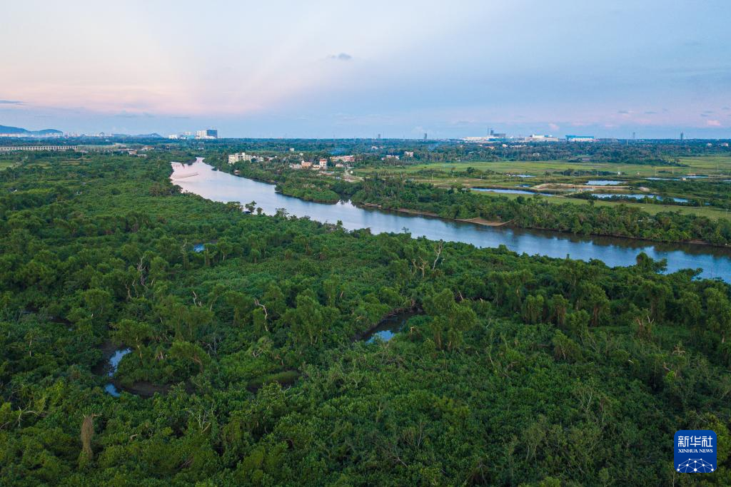 这是海南省文昌市文教镇加美村毗邻的文教河,河岸边有连片的红树林(无人机照片,9月3日摄)。