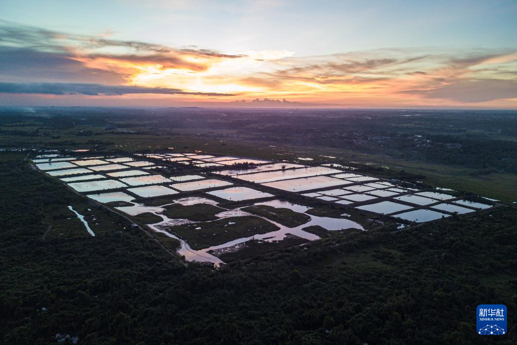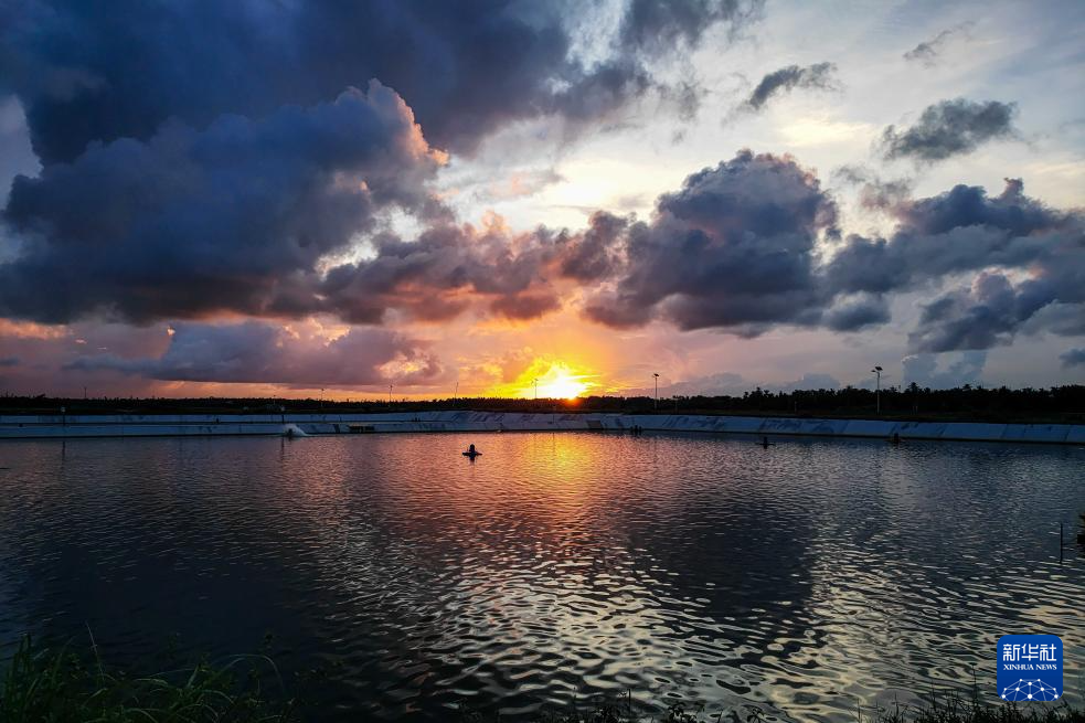 这是在海南省文昌市文教镇加美村拍摄的夕阳下的养殖塘(8月31日摄)。